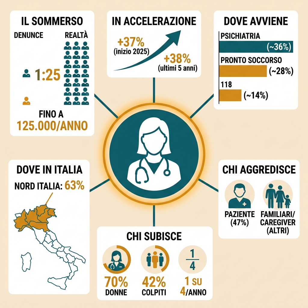 Se si guarda ai numeri, la dimensione del fenomeno è già sufficiente a incrinare questa lettura. In Italia si registrano circa 18.000 aggressioni annue nel sistema sanitario, con oltre 23.000 operatori coinvolti nel solo 2025; nel 2024 le aggressioni denunciate, tra pubblico e privato, sono state stimate in 25.940 (fonti: INAIL; Ministero della Salute). Sono numeri importanti, ma ancora parziali. Perché il dato che realmente cambia la prospettiva è quello sommerso: le stime parlano di fino a 125.000 episodi reali l’anno, a fronte di circa 5.000 denunce ufficiali. Questo significa che oltre il 90% delle aggressioni non viene nemmeno segnalato.